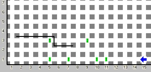 Finalmente, ¡Karel tiene su sitio en el mundo! Mueve el cursor del ratón hacia la esquina de la Avenida 15 y Calle 1 y da click con el botón derecho del mouse, situa el puntero del ratón en la opción "Situar a Karel" y elige "Orientado al Oeste". Ahora deberías visualizar el mundo de abajo. Haz de nuevo click sobre el botón "Guardar" , para almacenar los cambios.