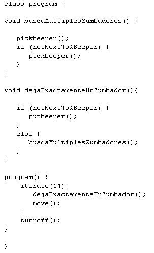 Date cuenta de como la instrucción iterate acaba moviendo a Karel una esquina hacia adelante, sin tener en cuenta en nẃ de zumbadores. Si haces esto 14 veces, ¡estarás en casa !