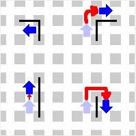 Esta instrucción hace que Karel avance correctamente hacia el siguiente segmento de muro. Los diagramas de abajo muestran las 4 situaciones, Karel podría estar en cualquier punto del laberinto. Si sigueMuroDerecha() resuelve correctamente los 4 casos, entonces has solucionado la parte principal del problema. También deberías definir turnright().