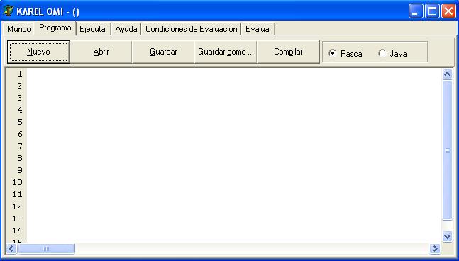 El lenguaje por default es Pascal, para programar en JAVA, selecciona la opción que viene a la izquierda de los botones. Ahora pulsa en el botón "Nuevo ". Un esqueleto del programa será creado automáticamente. Se creará un programa inicial. Este programa inicial contiene los comandos básicos que son necesarios en cada programa. Ahora deberías ver una ventana como la siguiente.